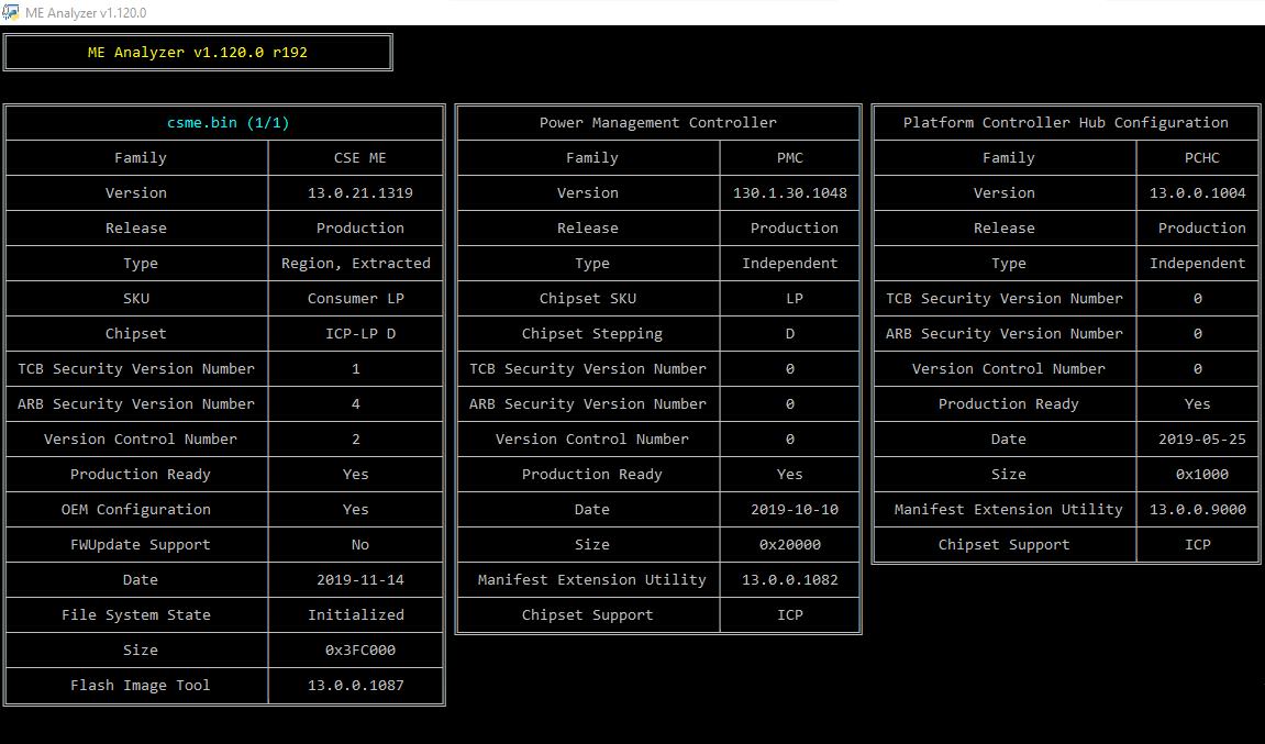 Moreover, with the help of its extensive databases, ME Analyzer is capable of uniquely identifying and categorizing all supported Engine / Graphics / Independent firmware as well as check for any firmware which have not been stored at the equivalent, community supported, Firmware Repositories yet.