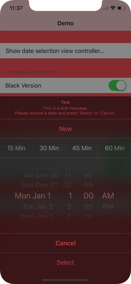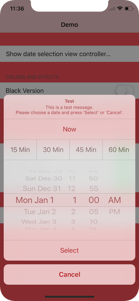RMDateSelectionViewController *dateSelectionController = [RMDateSelectionViewController actionControllerWithStyle:RMActionControllerStyleWhite title:@"Test" message:@"This is a test message.\nPlease choose a date and press 'Select' or 'Cancel'." selectAction:selectAction andCancelAction:cancelAction];