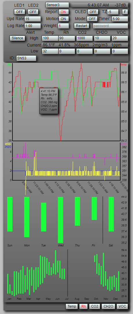 The web chart. Dark gray is off, cyan is fan running, blue is compressor+fan, NG is red, HP is yellow, rh is green, the target/threshold is the wave. The thermostat is in the hottest room in the house, so it does look warmer than it really is, but that's why there's a remote unit, and now multiple sensors.