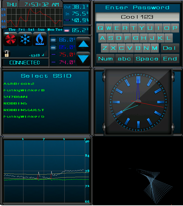Some screens including a keyboard and SSID chooser, but this is using the auto connect with SoftAP server (which attempts to find the stored SSID while waiting on input) so it should never be needed. The dimmed screensaver will change to a clock, and a few other odd displays over time.
