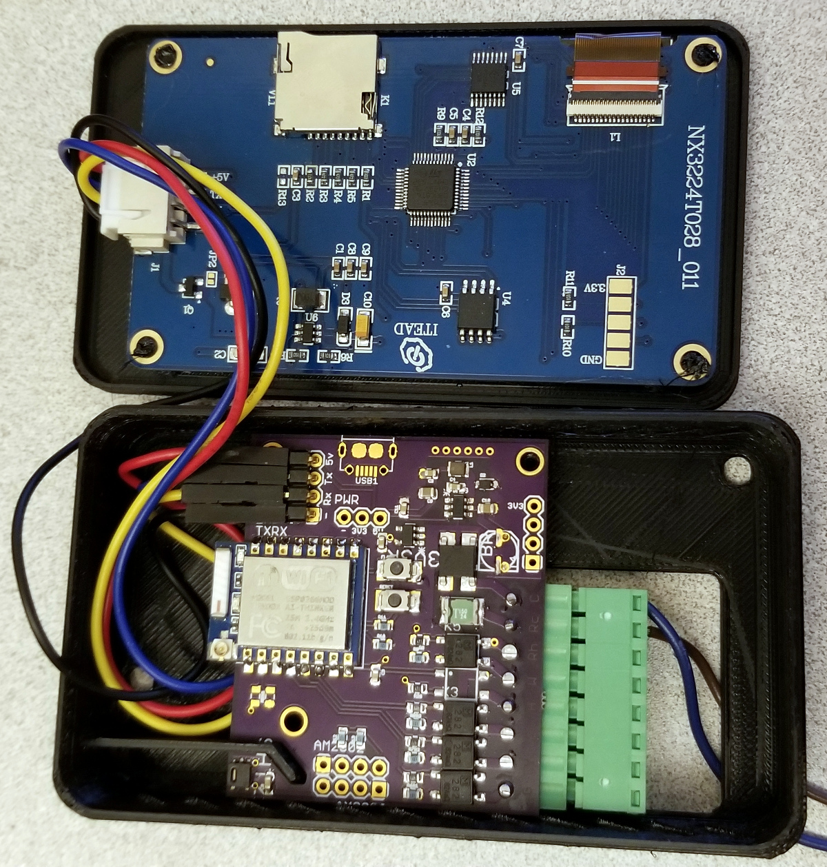 The "Basic" (Discovery model works without modification) has a 10K pullduown resistor for 5V tolerance (R13: next to the connector). Removing this allows the ESP8266 to boot normally and operate without any resistors added, or add a 10K pullup between TX and 3V3 when serial debug is not connected. I've opted for the removal of the resistor, which fixes all problems. The 5K6 on the thermostat (R17) allowed it to operate with serial connected plus the pulldown, but not without. The blue wire (data sent to the ESP) doesn't really need any resistors. The ESP can't be programmed without a 1K while both are connected, and with the 1K and debug the touchscreen won't work. So just disconnect the wire while programming and reconnect it after.