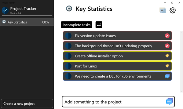 With the Project Tracker, easily create, manage, track, and develop all of your programming projects. At the heart of the Project Tracker is a simple to-do list. Create tasks for each project, categorized by three simple criteria (error, feature, or comment). You'll be able to manage all of your development tasks and to-do's better with Project Tracker's blazingly fast features and intuitive design created for developers.