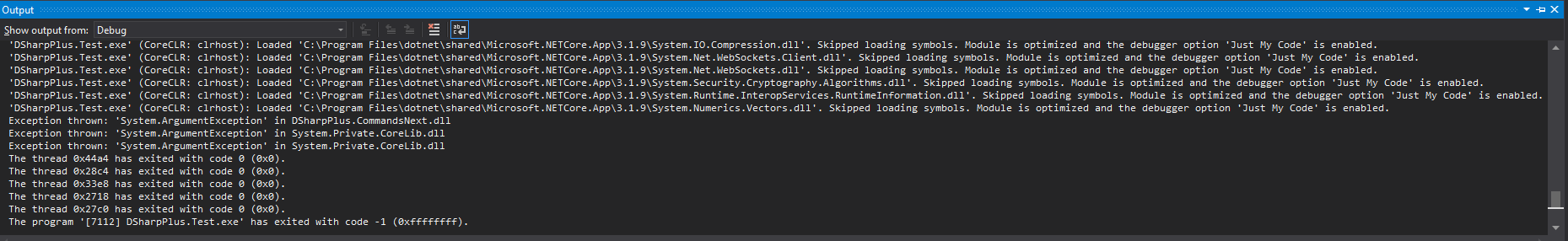 Does it not print that exception to the console? Looks like the debugger output to me (it's showing threads starting and stopping), and even in Rider the debugger output simply says an exception happens, but the stack trace is in the console |