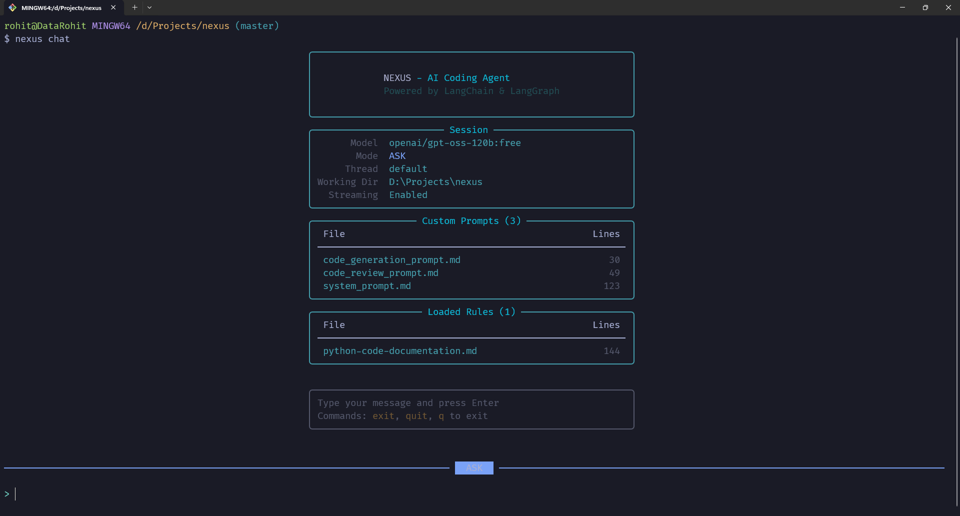 • Custom Prompts - Load custom system prompts from .nexus/prompts/