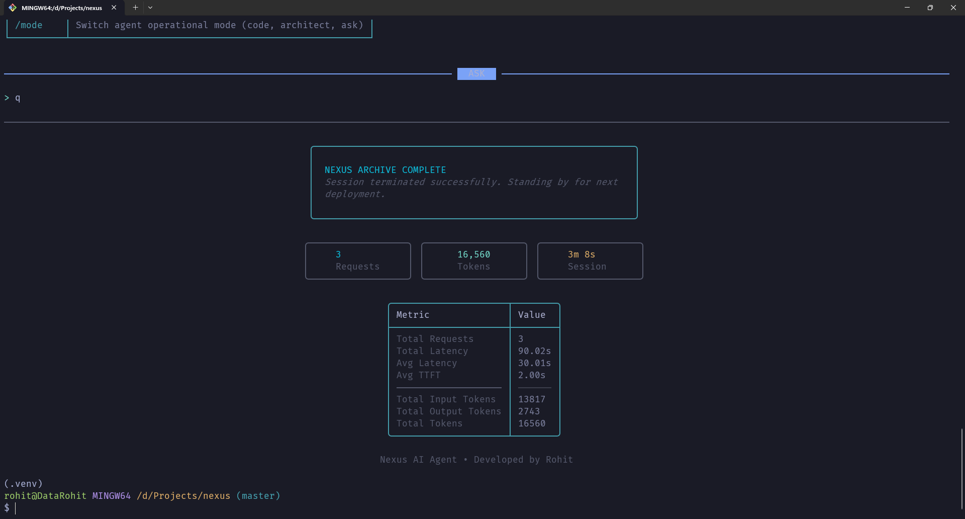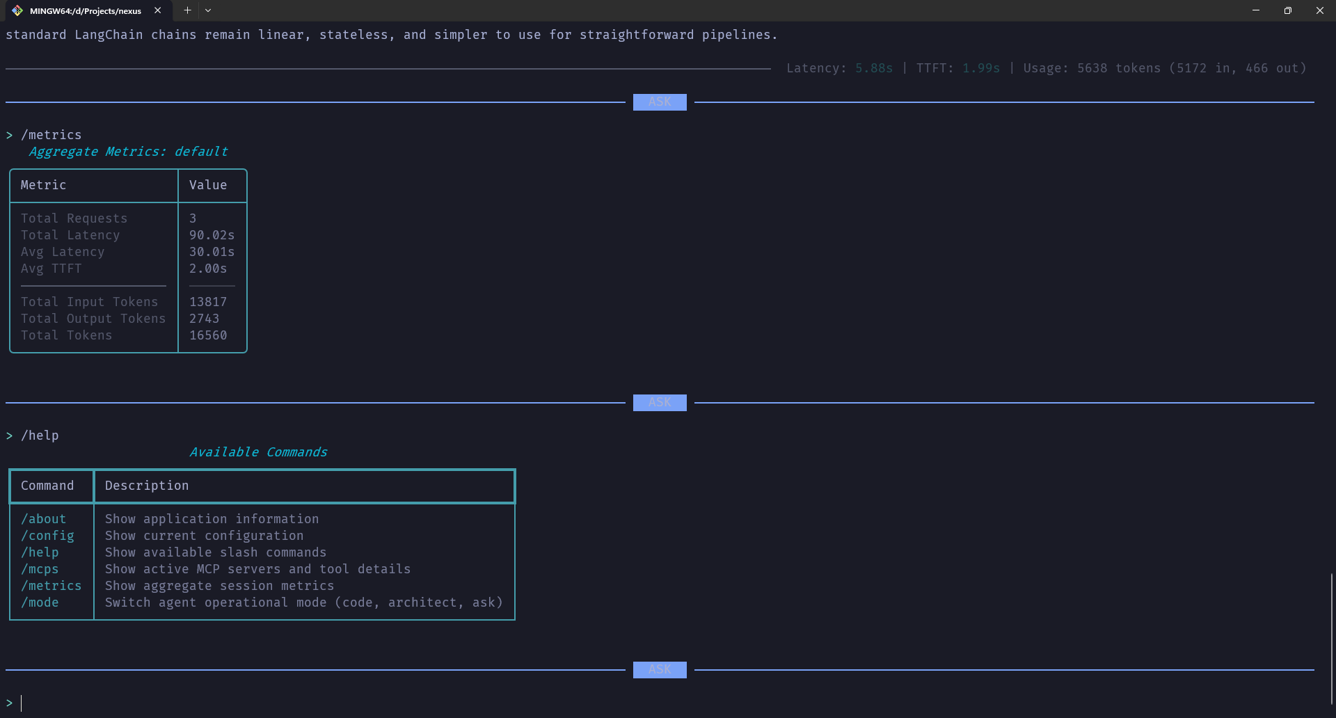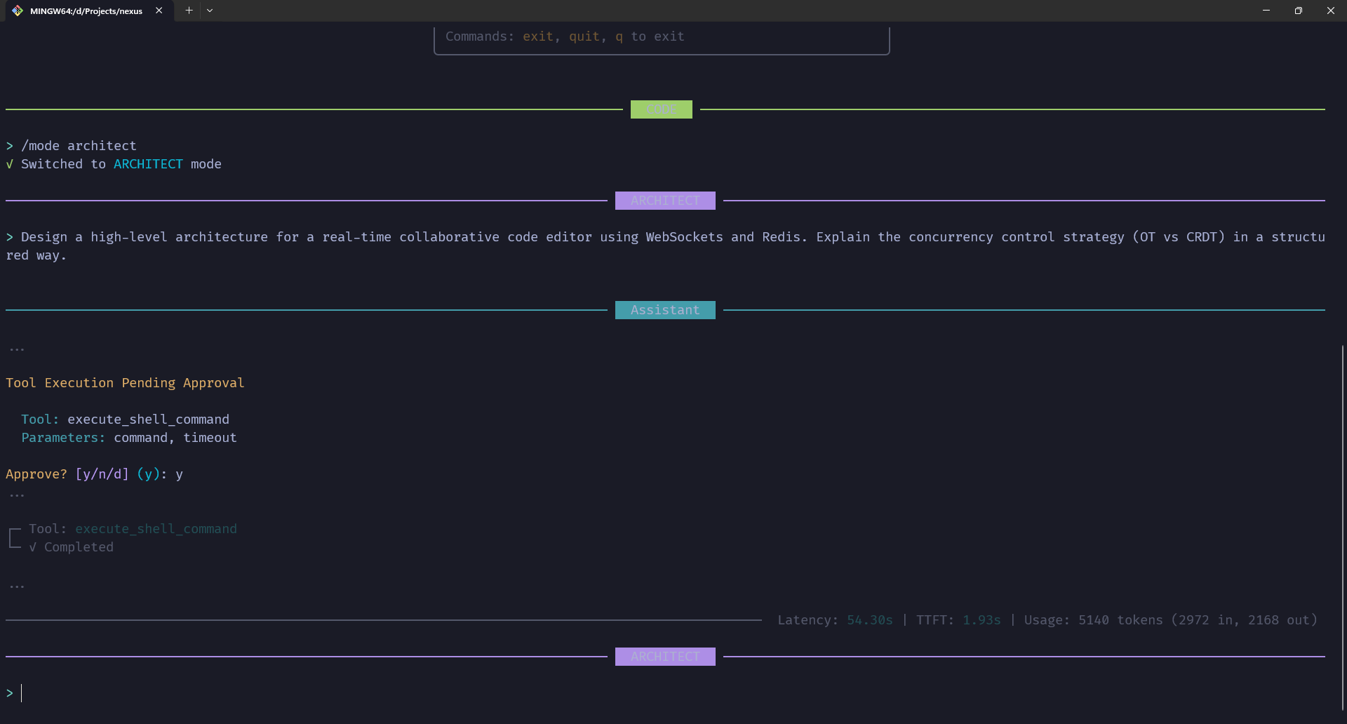 Nexus is an autonomous CLI coding agent powered by LangGraph and MCP. It plans complex tasks, persists context via SQLite, and securely orchestrates tools. Features specialized Architect/Code modes, real-time metrics, and human-in-the-loop safety for production workflows.