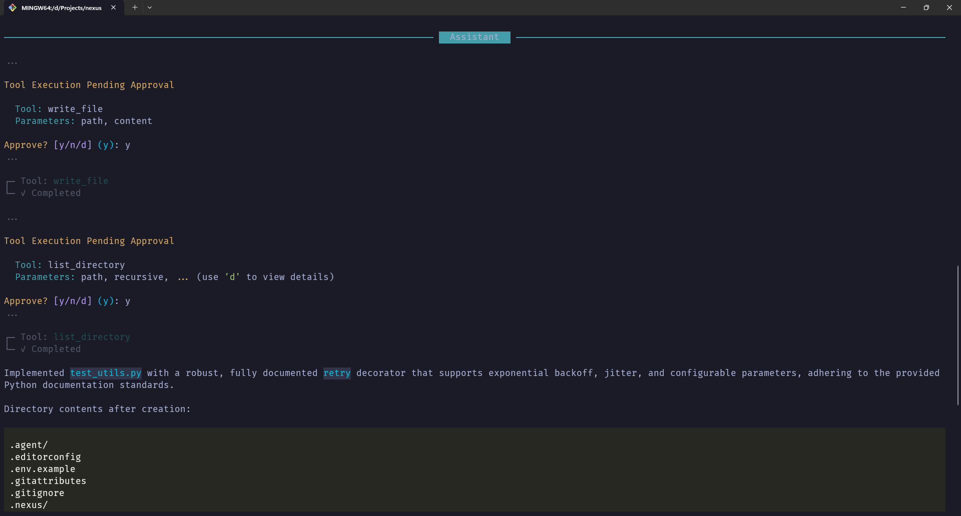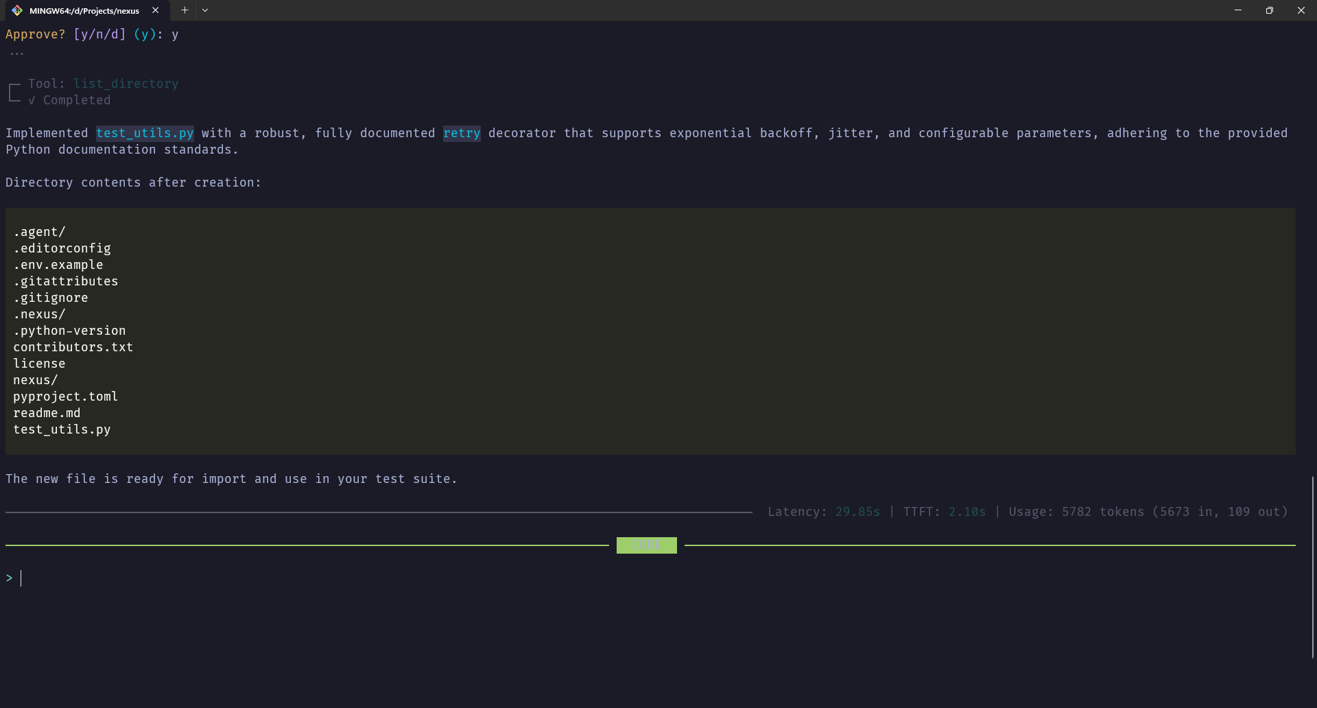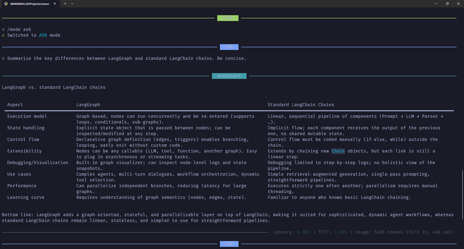 Nexus is an autonomous CLI coding agent powered by LangGraph and MCP. It plans complex tasks, persists context via SQLite, and securely orchestrates tools. Features specialized Architect/Code modes, real-time metrics, and human-in-the-loop safety for production workflows.