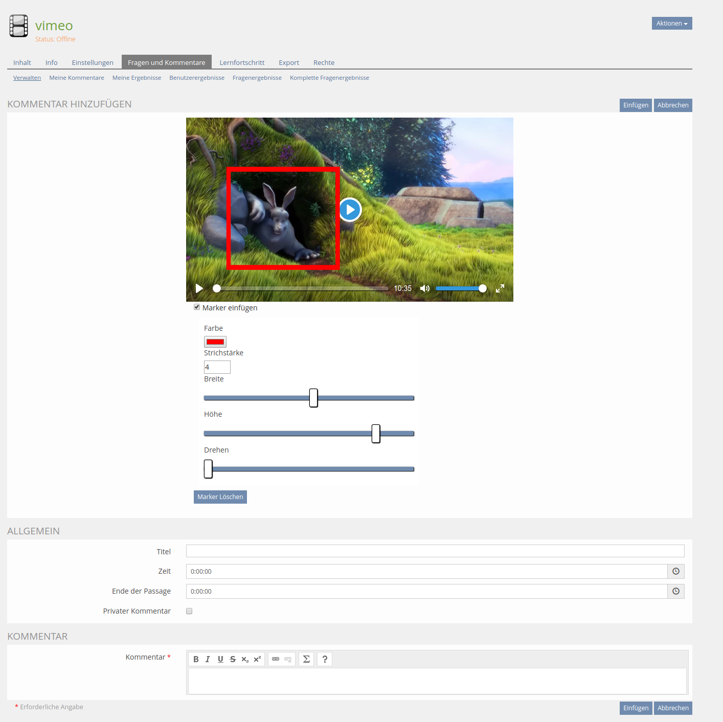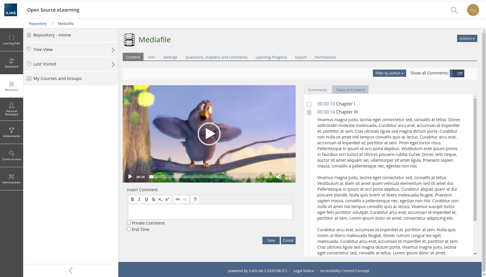 The InteractiveVideo Plugin for ILIAS gives you the possibility to create a video object, where your students can communicate in a asynchronous way. Please note that this is NOT a chat. They can leave notes on different timestamps in the video for other students to read, or only for themselves. Further a tutor can insert questions on various positions in the video for the students to answer. At the moment three questions types are supported single and multiple choice and a reflective type.