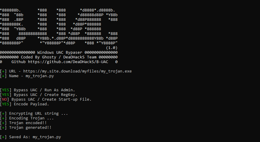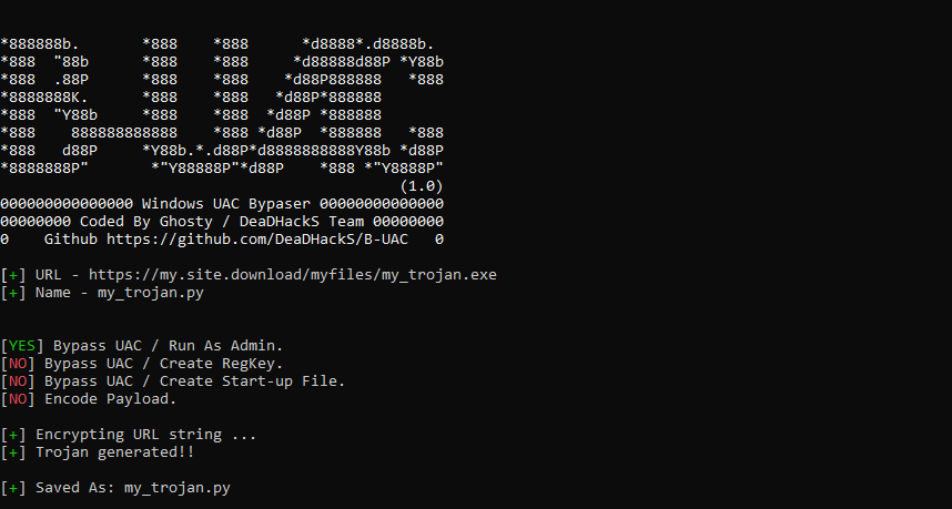 B-UAC is a Windows UAC Bypasser Trojan Generator (WUBTG), it can generates python trojans to bypass UACs and execute any of your Metasploit or Viel-Evasions payloads! It also has a unique persistence option as start-up file, service agent and registry key.