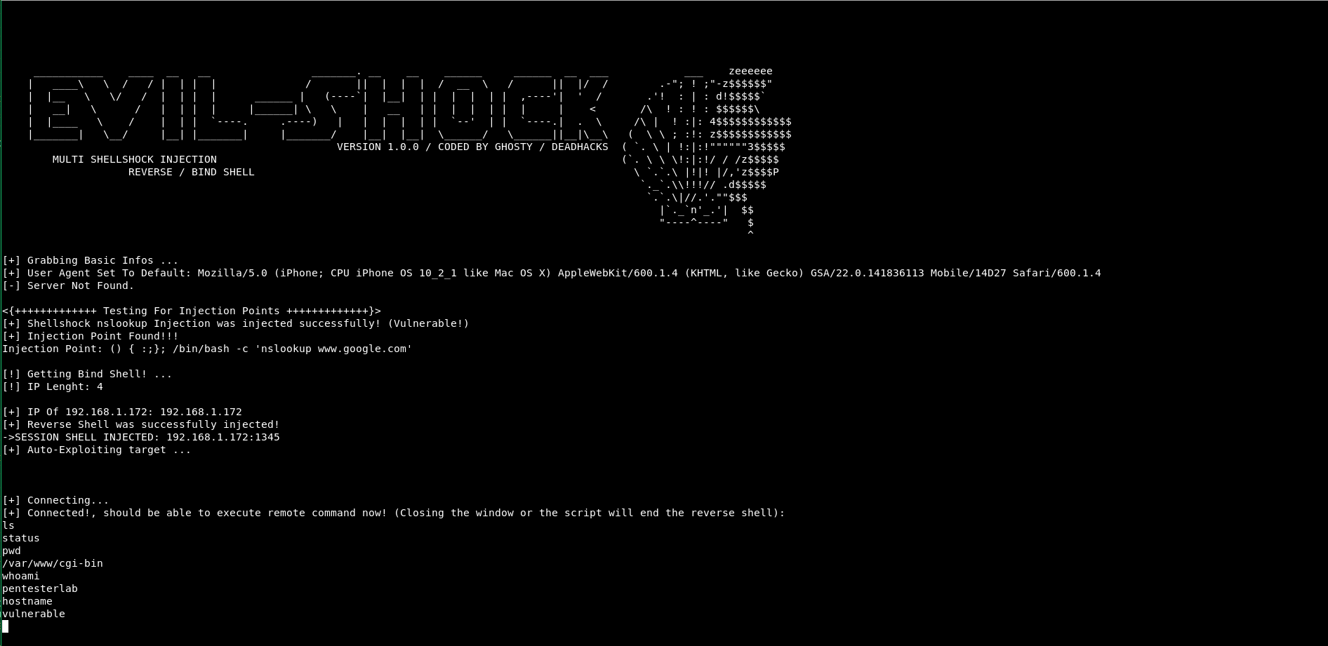 Evil-Shock is a powerful tool made to exploit Shellshock, what's special with Evil-Shock is that it doesn't base his attacks on one parameter, example another tool might inject a simple "echo Vulnerable" and see if the server executes that. In many case the server wont execute that command but can execute another command ;) Evil-Shock will find the perfect command also known as Injection Point and then execute further commands to gain remote access via the injection point, so far for the first version Evil-Shock can check for 4 different Injection Point: