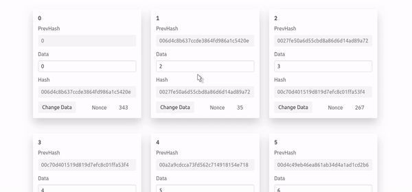 You can Change the contents of blockchain by inputing data and clicking Change Data Button It Corrupts the blockchain and display corrupted Chain in Red Color