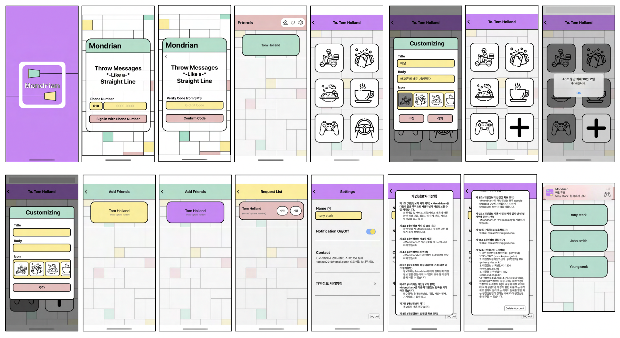 Mondrian은 친한 친구사이에 간단하게 용건을 전달해야하는 상황을 타겟팅한 메신저 서비스입니다. 메시지를 보낼 친구를 선택하고 버튼을 누르면 버튼에 미리 등록된 메시지가 친구에게 푸시메시지 형태로 전송됩니다. 자주 보내는 메시지를 미리 등록해두고 상황에 따라 즉시 푸시를 날릴 수 있습니다. Mondrian은 자주 연락하는 친구에게 자주 꺼내는 주제를 던질 때 가장 경제적인 선택지가 될 수 있습니다.