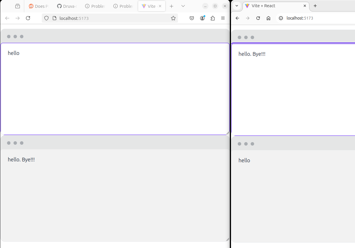 To check its working, you have to open two windows(or two tabs : http://localhost:5173/ ) and type in each of the windows, you'll see the text of one appearing in the other in the respective textareas of the windows.