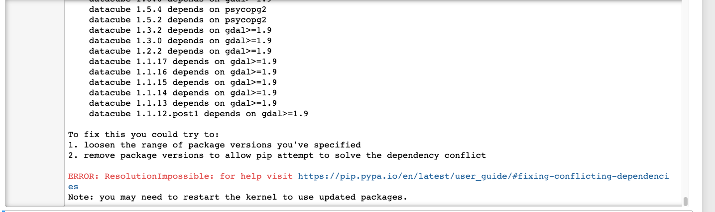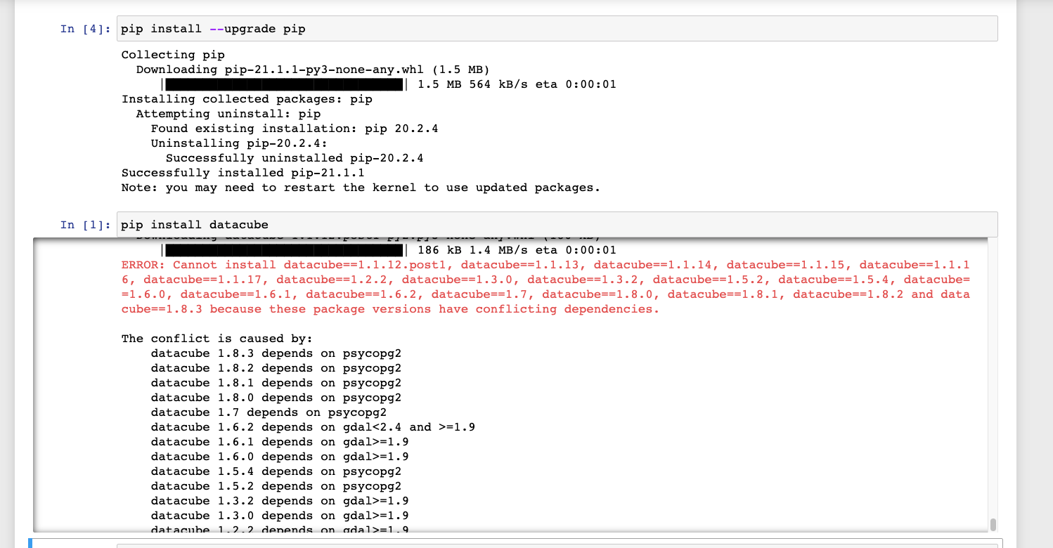 Hello everyone. I am having trouble installing data cube. I am using pip install and have just updated pip, but I get this error message shown below. Could someone help me with this? Thanks so much. |