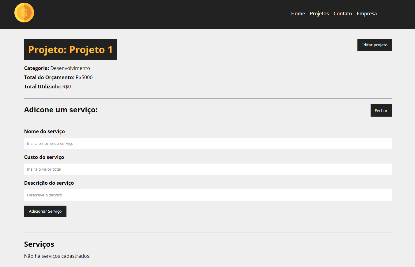 - Adicionar Serviços: Dentro de um projeto, adicione serviços com nome, custo e descrição.