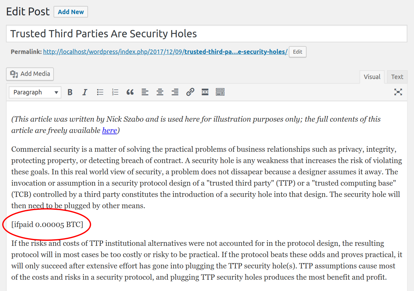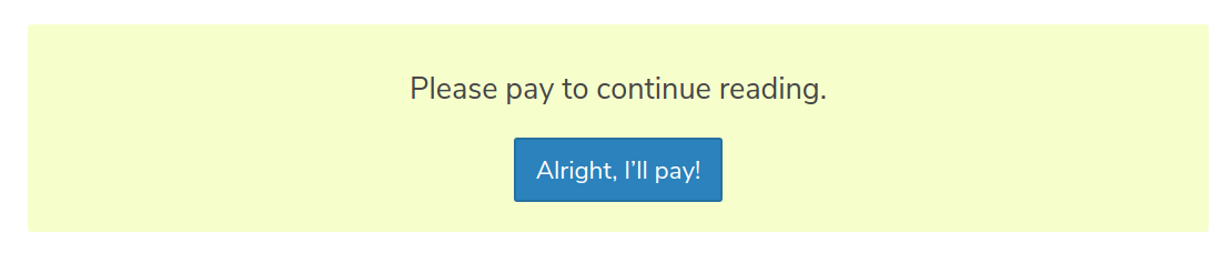 You may also specify a custom message and button text, as follows: [ifpaid 0.005 ILS text="Please pay to continue reading." button="Alright, I'll pay!"]. This will show up as: