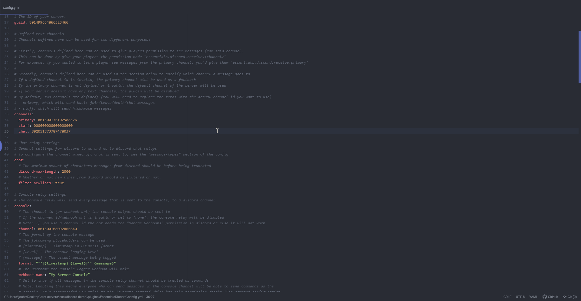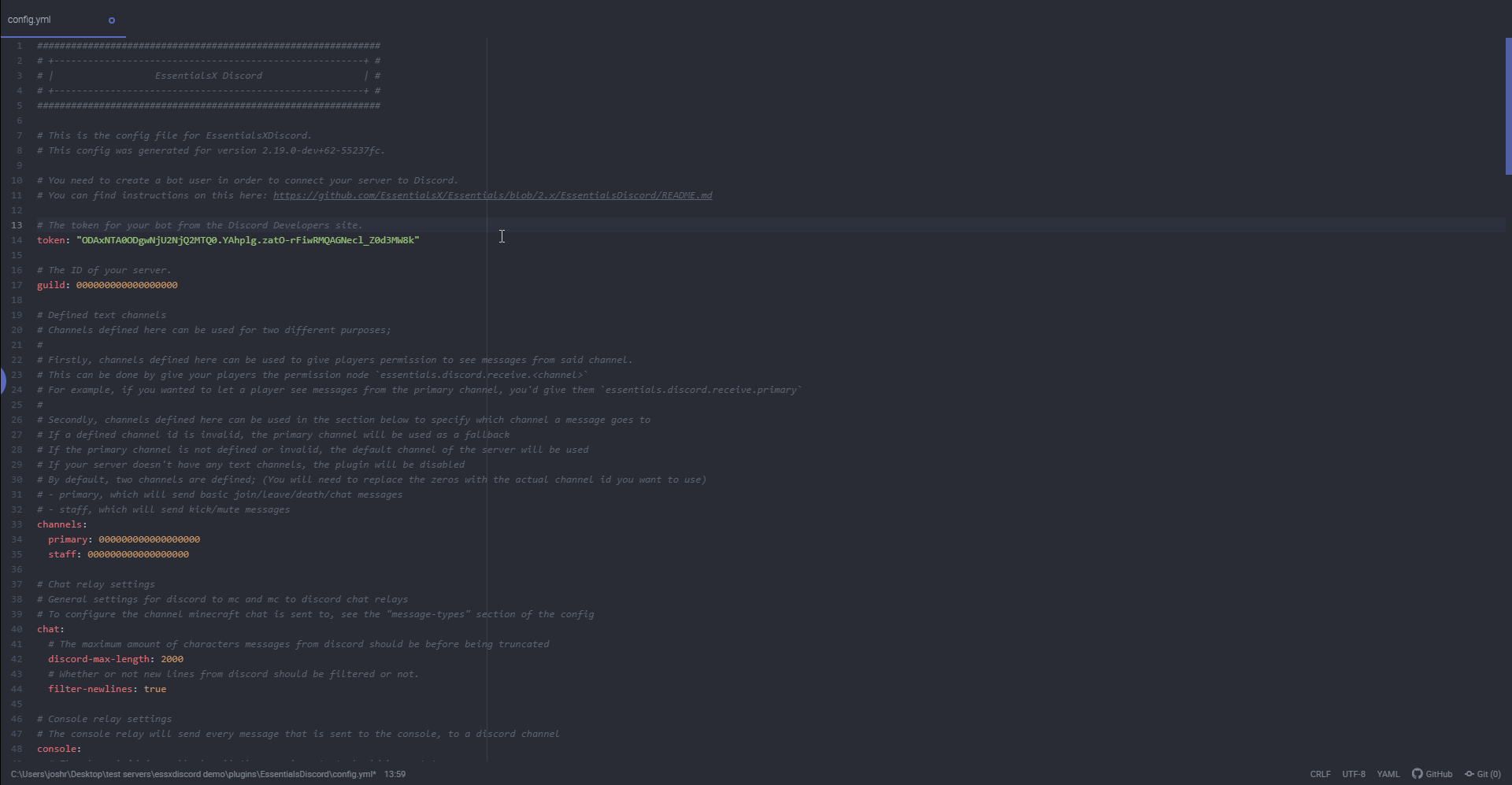 plugins/EssentialsDiscord/config.yml. When you open the config, the first thing to configure is your bot's token. ReplaceINSERT-TOKEN-HEREin the config with the token you copied earlier from step 6.