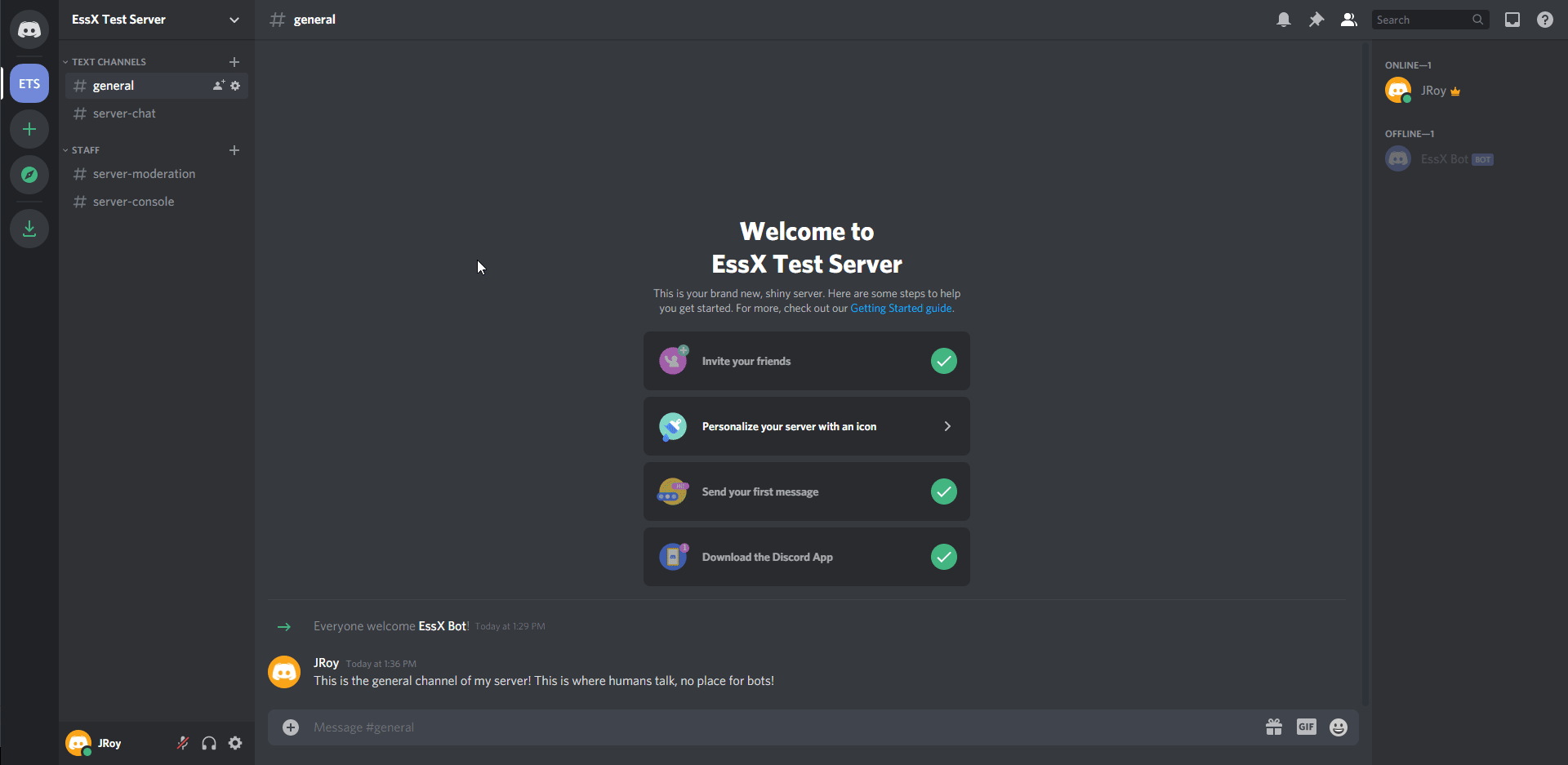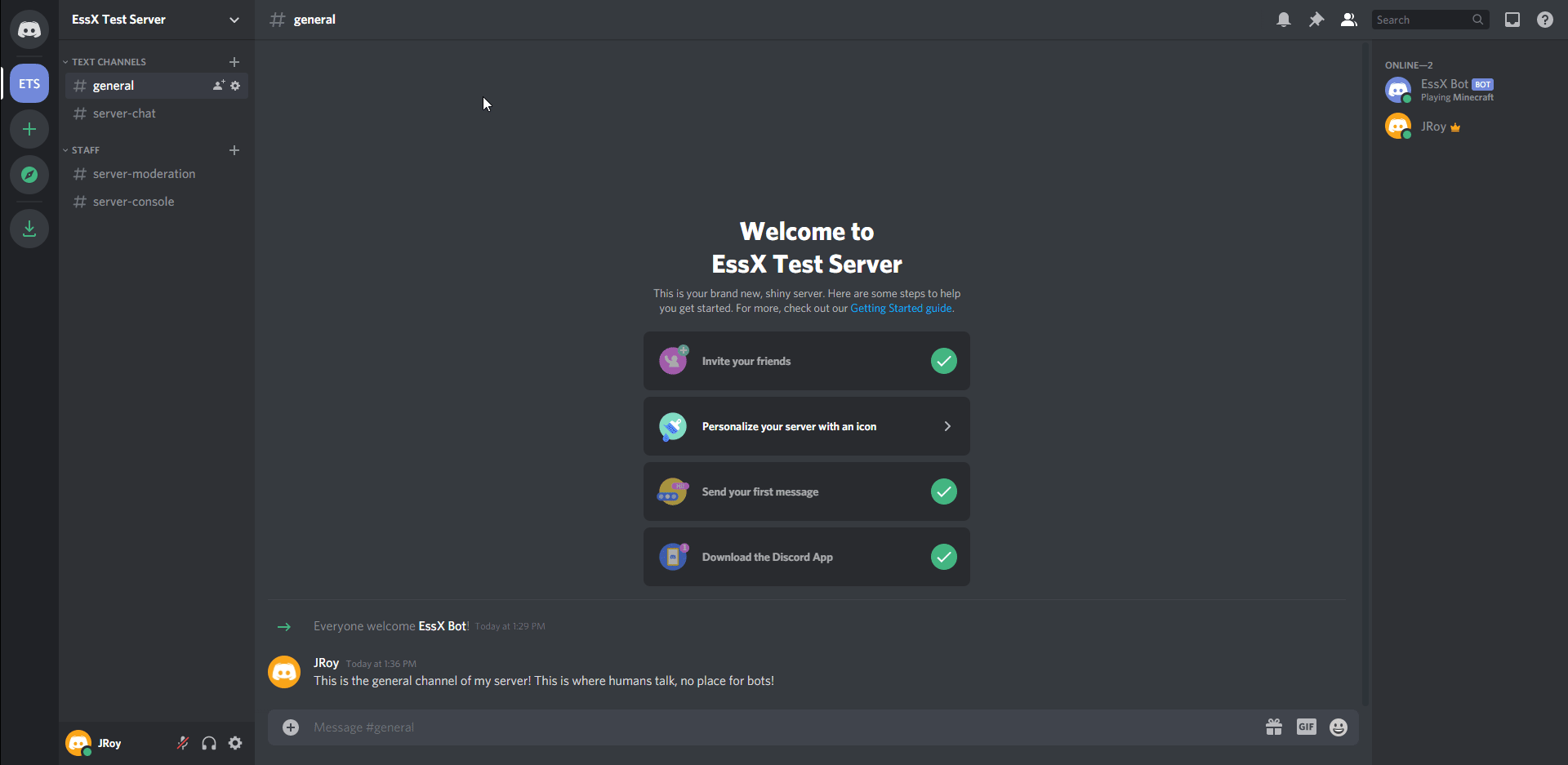 - Congratulations, you've completed the initial setup guide! When you start up your server, you should notice that chat and other messages start showing up in the channel you requested they be. Now that you completed the initial, go back up to the Table Of Contents to see what other cool things you can do!
