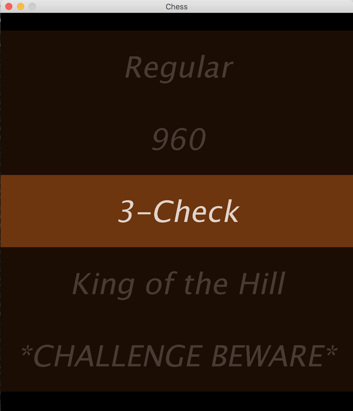 A chess program which supports the chess variants 960, 3-Check, King Of The Hill, as well as the regular game of chess. Full AI implementation using Minimax + alpha-beta pruning, opening tables, and endgame tablebase.
