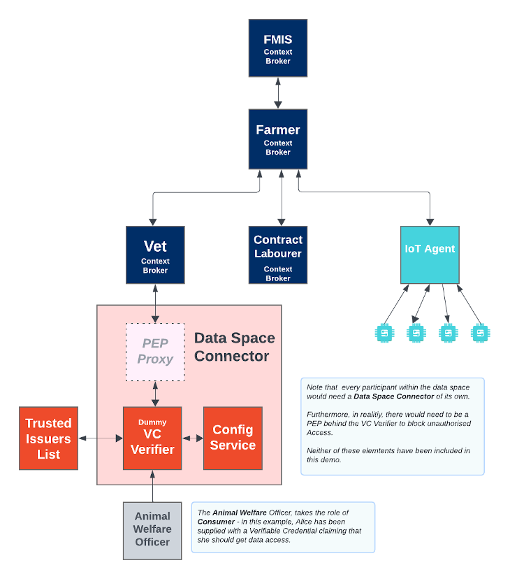 In addition, our Vet will be protected via a dummy data space connector, the data space connector is spoofing the role of a VC Verifier . it in turn connects to some other FIWARE Data Space components: