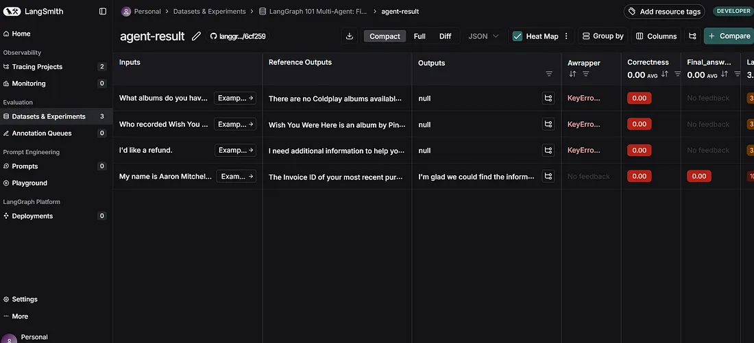 Our LangSmith dashboard contains the results of our evaluation, showing parameters such as correctness, final results, their comparison, and more.