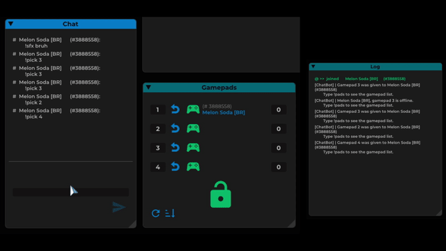 - Role tiers for chatbot commands. Guests have their own set of commands like "pick a specific gamepad", "drop gamepad" and "play sound effect". And admins can ban/unban guests from chat commands.