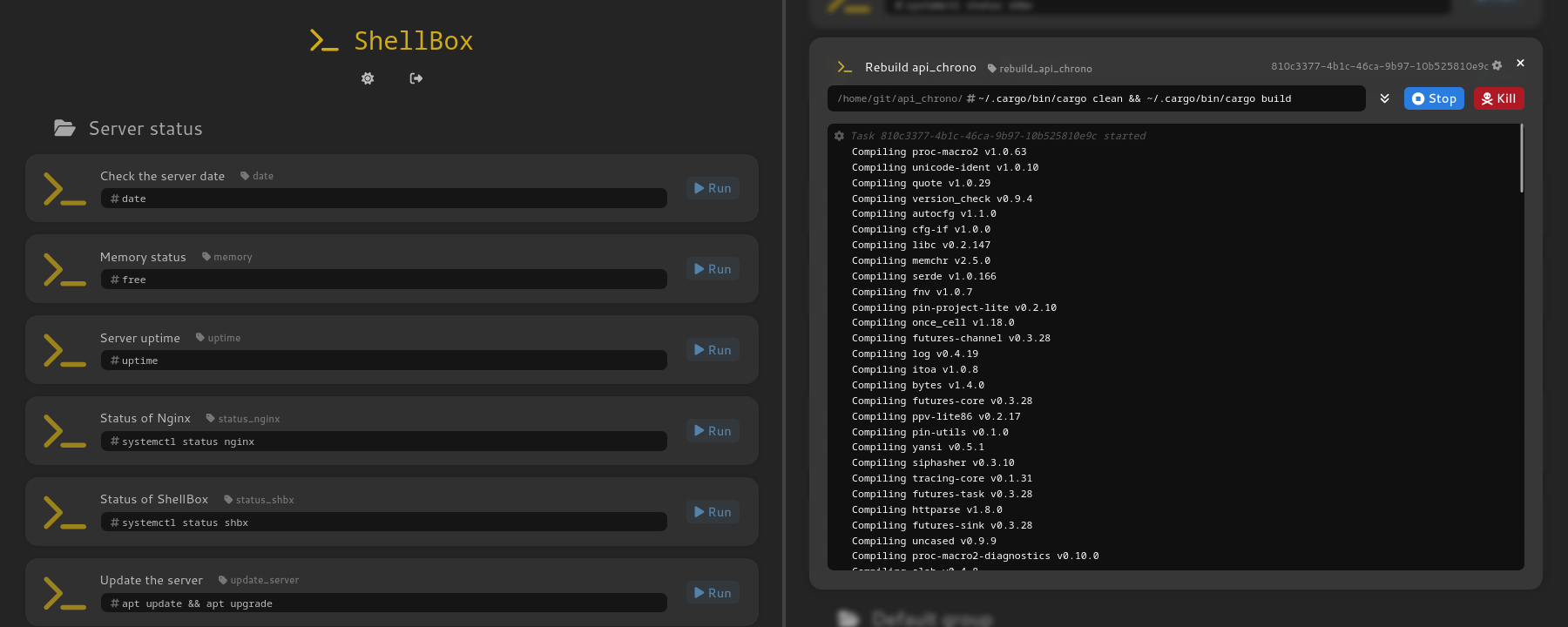 ShellBox / shbx is a simple API-based open-source service with a Web UI that simplifies running commands and managing tasks on a remote server. Its main goal is to give some secure and restricted control over a server to other users or systems, without entrusting them with an SSH access.