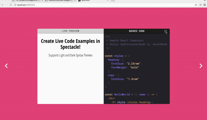 @philpl I implemented a custom "editor" component and also integrated a fullscreen mode by putting the content into a wrapper with absolute positioning and a z-index. This works even if spectacle is already in fullscreen mode. |