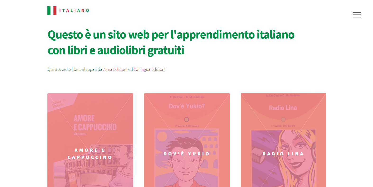 Italiano è un sito web per l'apprendimento italiano con libri e audiolibri gratuiti, sviluppati da Alma Edizioni, Edilingua Edizioni, ecc.