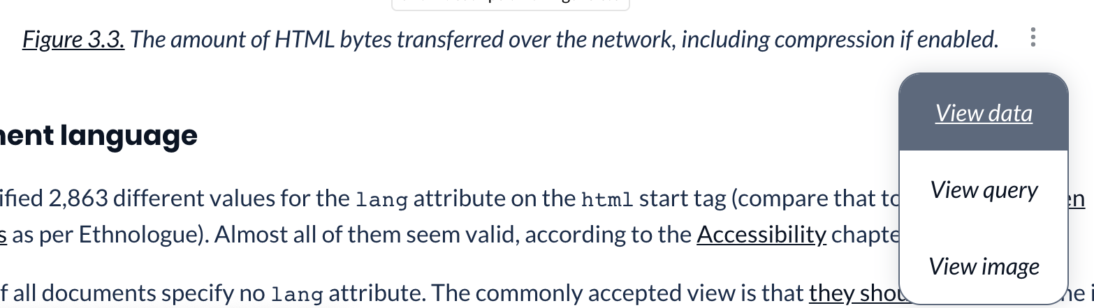 It should be on all figures sourced from HA data, regardless of type, since readers should always have a way to drill down into the results and the queries that generated them. For that to work in practice, the buttons should be unobtrusive, especially because they're visible on every figure. To help readers know it's there but not get distracted by it, I think a combination of iconography (dots/burgers) and removing the default button border could help it blend in more seamlessly. |