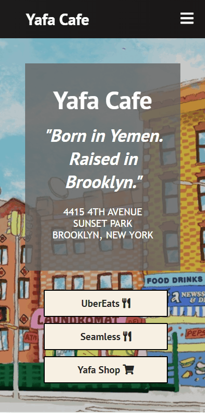 Yafa Cafe -- Walkthrough shown below Redesigned a local Yemeni-American resteraunt's website from scratch using React! Website is completed! Just waiting for final sign off by the restaurant owners 🙂 Check out how it looks below! Mobile View Before Mobile View After Desktop View Before Desktop View After