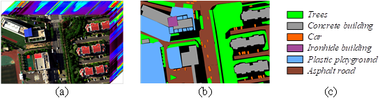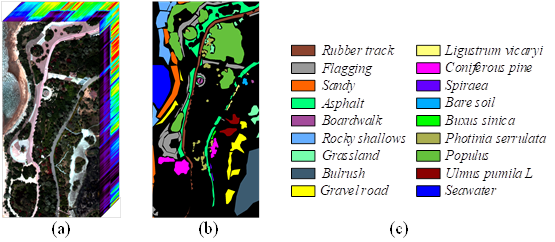 The QUH-Tangdaowan dataset: it contains a variety of irregular land covers with very similar spectral curves, such as four vegetation species: Coniferous pine, Buxus sinica, Populus, Ulmus pumila L, and three pavements: Flagging, Boardwalk, Gravel road, which undoubtedly poses a great challenge for precise classification.