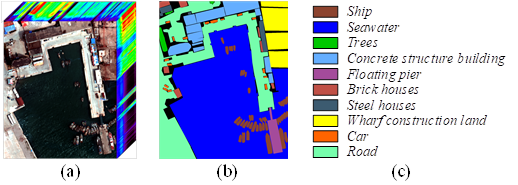The QUH-Pingan dataset: it has a relatively regular distribution of land cover, but there are large differences in size: Seawater, Road at large scales, Trees, Floating pier, Brick houses, Steel houses at medium scales, and Ship, Car at small scales, which are the most difficult to identify. This dataset can be used to assess the ability of classification methods to portray targets at different scales.