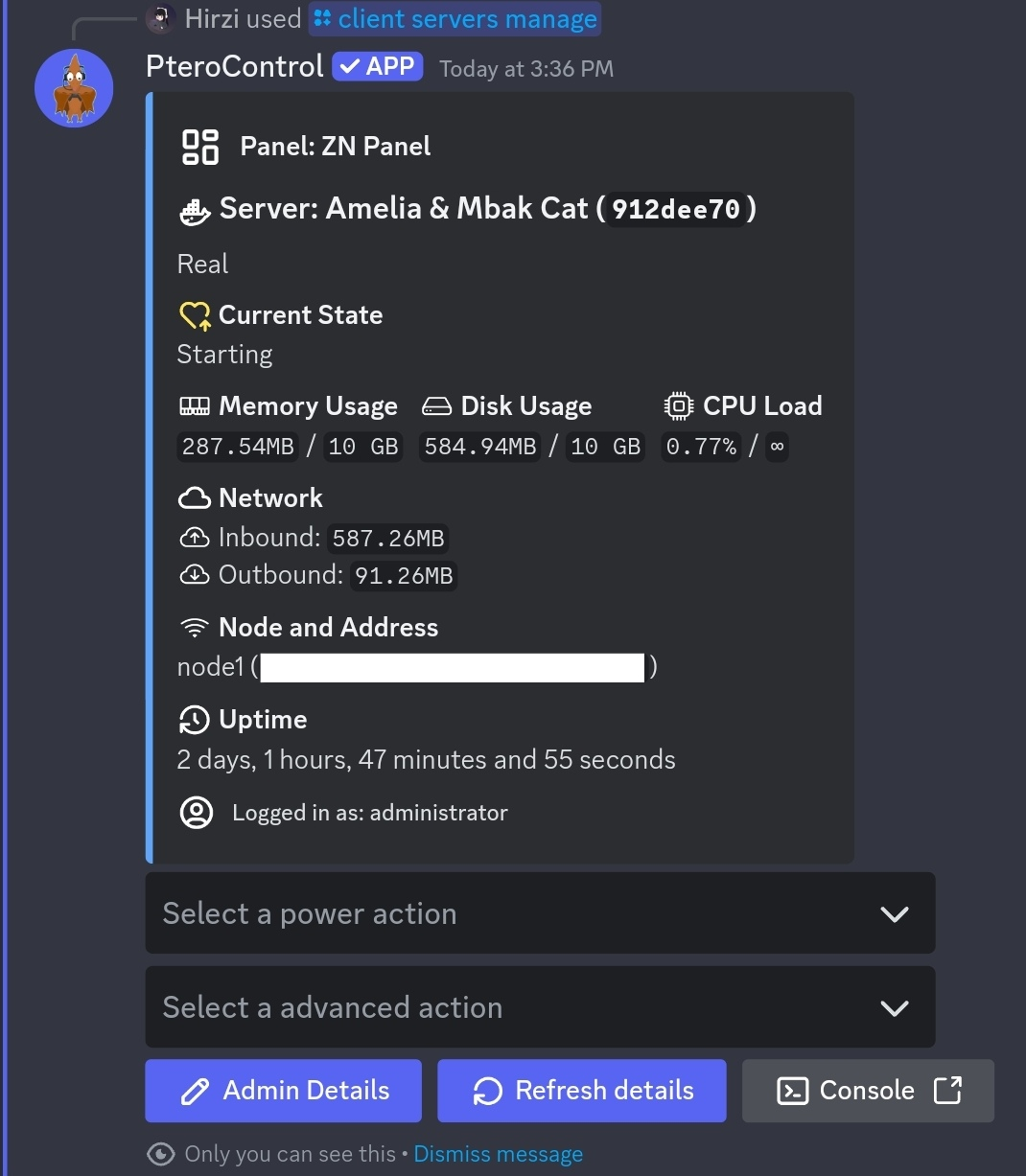 PteroControl is a Discord bot that allows you to control your panels running Pterodactyl or Pelican directly from Discord.