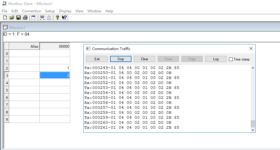 我们使用Modbus Slave软件来模拟从机。并且设置相应的地址里面的数值为1和2。软件使用方法可自行百度、google。下图为软件设置及运行结果。