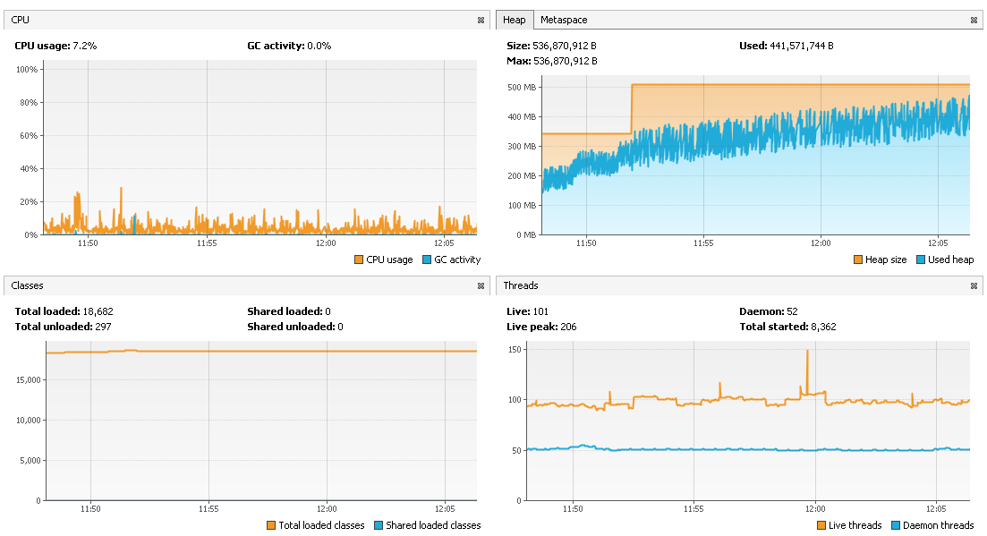 - Point VisualVM at the client. The heap size and usage ~225mb.