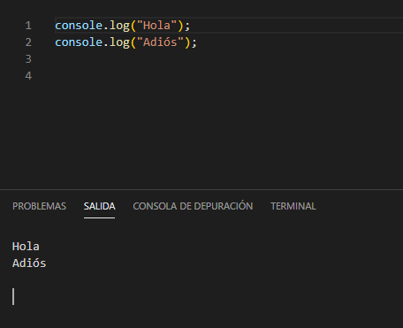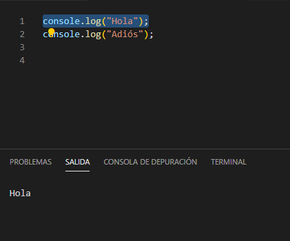Ya hemos ejecutado código con la extensión Code Runner. Ahora vamos a ejecutar sólo el código seleccionado. Primero escribimos lo siguiente: