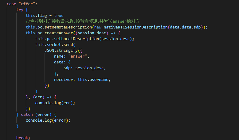 新人接受到对方同意的指令后,将对方的音视频流通过setRemoteDescription函数进行存储,存储完后新人创建answer来获取自己的音视频流,通过setLocalDescription函数存储自己的音视频流,并发送answer指令(携带自己的音视频)告诉对方要存储邀请人的音视频