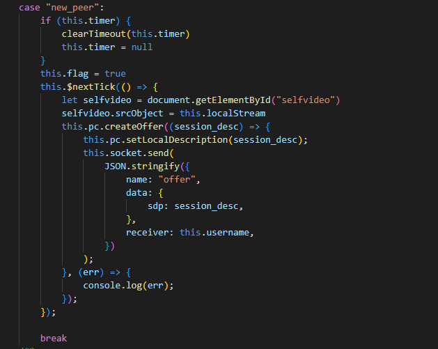 - 被邀请人点击同意后,获取自己的视频流,初始化PC源,PC添加音视频流,创建offer,获取自己的音视频流,并通过setLocalDescription函数存储自己的音视频流,并发送new_peer指令(携带自己的音视频)告诉房间的人,我要进入房间