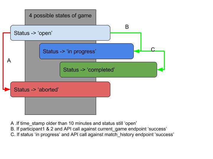 By using multiple API calls against League Server to achieve the shifting between the status of games. Using Agenda - a light-weight job scheduling library for Node.js, system is able to concurrently schedule jobs to facilitate the checking and status setting/updating against the mongo database.