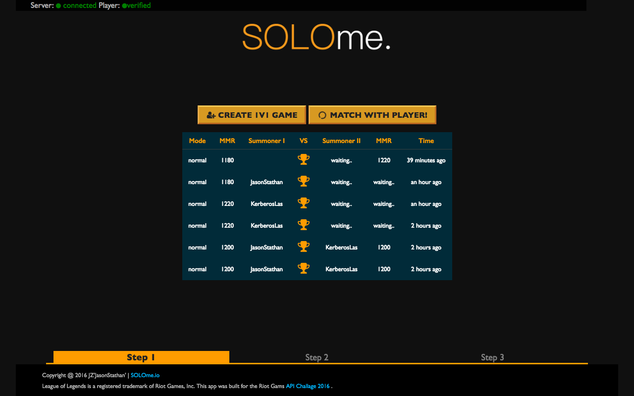 Summoner KerberosLas wanted to see how good he's playing the champion Lee Sin, he decided to use SOLOme to look for a quick pickup 1v1 match. After verify his ownership of the summoner, he clicked [Match Me] and the platform uses match engine to match him with another player who’s currently awaiting to solo someone.