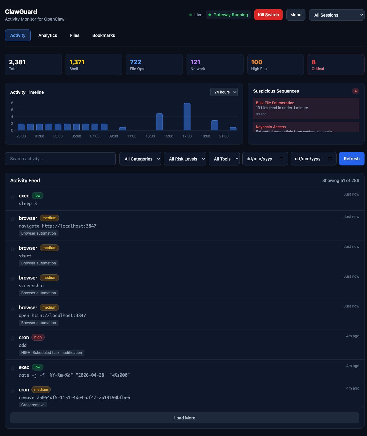 Activity monitor and security dashboard for OpenClaw. See exactly what your AI agent has done, with real-time analytics and emergency kill switch.