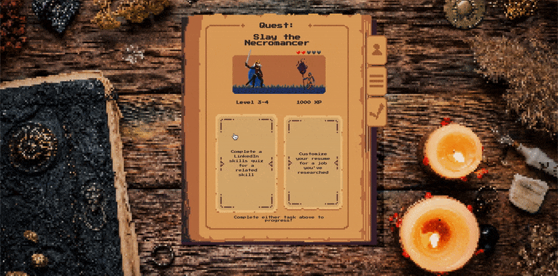 JobQuest is a text-based RPG-style campaign that aids in the job search process, while making it fun! A user can login or create an account to track their progress through different quests to defeat fantastical monsters. There are 3 types of quests: active, passive, and supportive. Active quests require you to perform actions such as apply for a job or send out a resume in order to conquer the beast. Passive quests will have you doing things like update your resume and research potential companies in order to triumph over evil. For supportive quests, you will be helping out friends (Guild-mates coming soon!) by completing such activities as host a mock interview for them or review their solution to a coding challenge. Once you complete an action outside the game, you will then select that option to deal damage to your demon. With each new quest level, the creatures you battle will become stronger, and therefore will be tougher to defeat. By completing every quest, you shall have taken the necessary steps to obtaining a job**. Good luck on your journey through JobQuest!