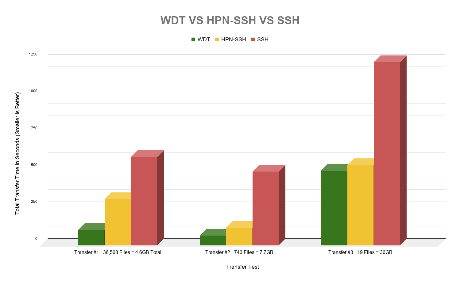 Below are timed downloads(in seconds) over my personal network which is 1 Gigabit. Each progressive transfer increases the total size of the transfer in GB, while reducing the total number of files being transferred. WDT easily maintains near full 1 Gigabit saturation across all 3 transfers while HPN-SFTP and SSH struggle to transfer multiple small files(single-thread limited). With encryption disabled HPN-SSH reaches full saturation when transferring large files, while stock SSH continues to struggle under heavy load. If you have access to +10 Gigabit networking hardware you can expect WDT to scale to ~40 Gigabit and HPN-SSH to scale to ~10 Gigabit.