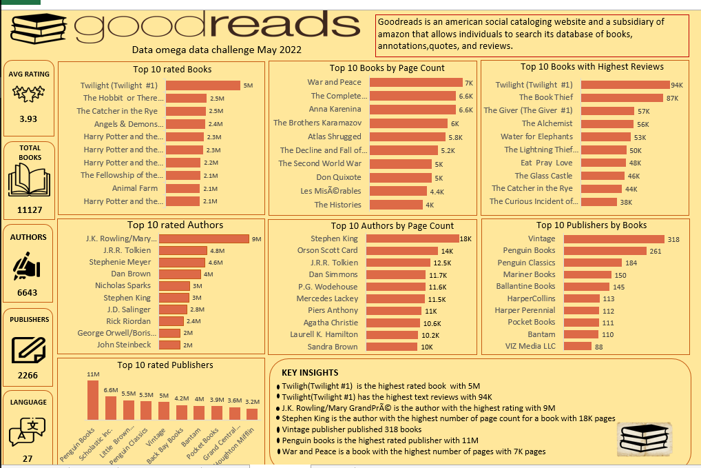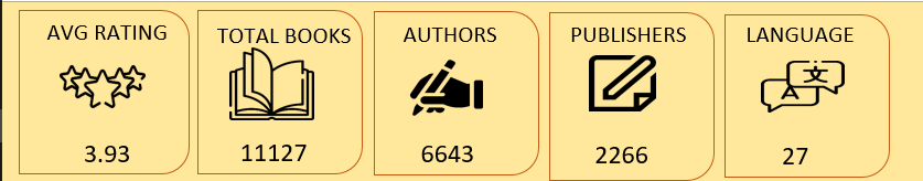 The total books recorded were 11127 with an average rating of 3.93. it can be observed that there were 6643 Authors, 2266 Publishers and a total of 27 languages were used, with English being the predominant language with 80%