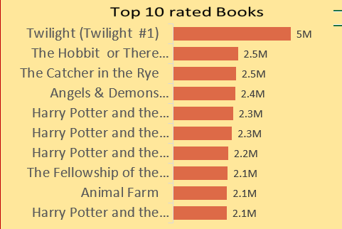 Twilight topped both the best rated book and books with the highest reviews with 5M and 94K respectively.
