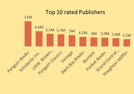 Top 10 publishers that published several books , penguin book is the best rated publisher with 11M. Penguin book is a British publishing house, they are a group of proud publishers of gifted storytellers with 261 books published and vintage published the highest number of books with 318 books.