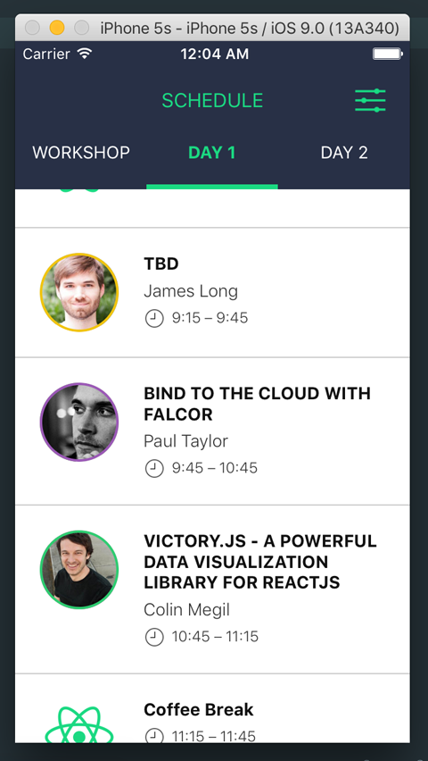 Based on my experience, first thing you want to see - schedule. By tapping on list item you can reach talk details or speaker's bio. If for some reasons you want to filter talks, you can do it by clicking "settings" button at navbar on schedule screen. This app has been built for ~48-60 hours.