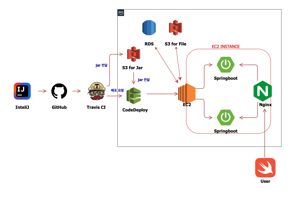 GitHub master branch에 푸쉬가 이뤄지면 TravisCI를 통한 테스팅 과정 및 빌드가 진행되고 jar 파일을 AWS S3에 저장합니다.(CodeDeploy에 저장 기능이 없기때문)