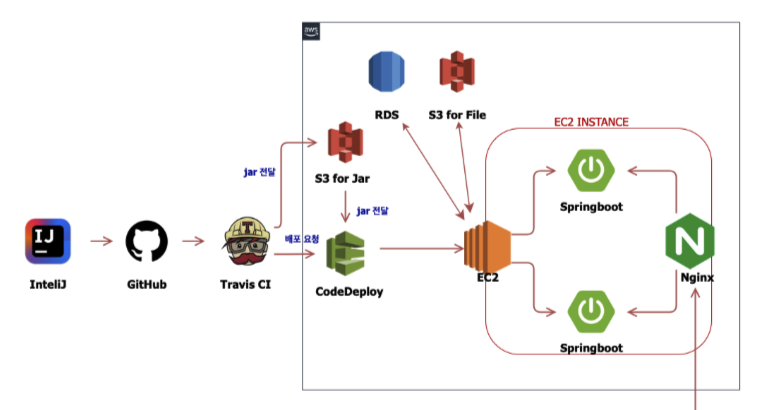 GitHub master branch에 푸쉬가 이뤄지면 TravisCI를 통한 테스팅 과정 및 빌드가 진행되고 jar 파일을 AWS S3에 저장.(CodeDeploy에 저장 기능이 없기때문)